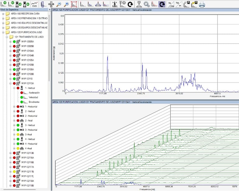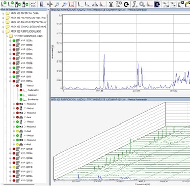 Aplicación de análisis espectral y de tendencia para identificar fallas incipientes en equipos rotativos como motores, bombas, ventiladores, reductores y turbinas.